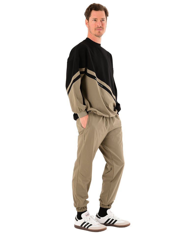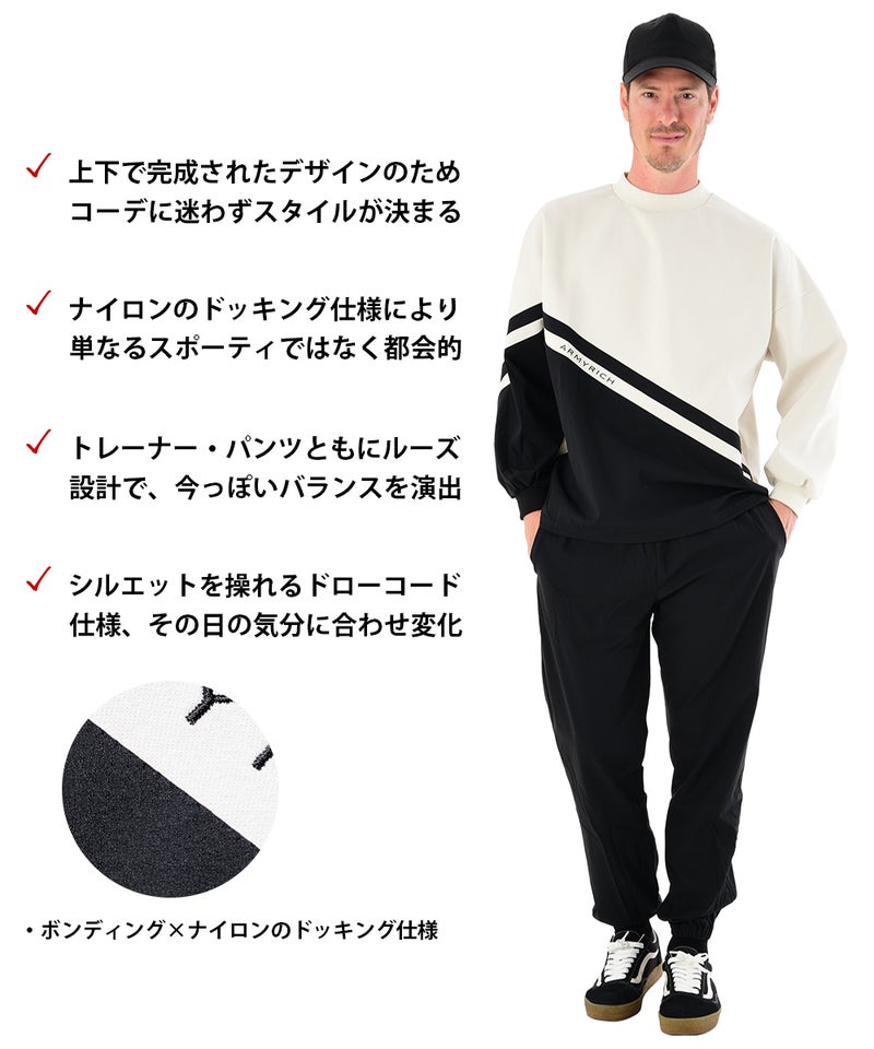 ARMYRICHより、異素材の切替デザインが印象的なドッキングトレーナーセットアップが登場。 ボンディング素材とナイロン素材を組み合わせたドッキング仕様により、スポーティさの中に都会的な雰囲気をプラスしたデザインです。