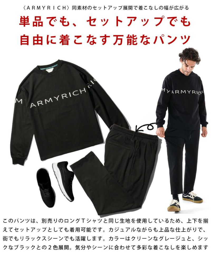ARMYRICHの「ソロナ生地イージーパンツ」は、スキニー以上ワイド未満の絶妙なバランスで、オンでもオフでも着こなしやすい万能シルエットが魅力。