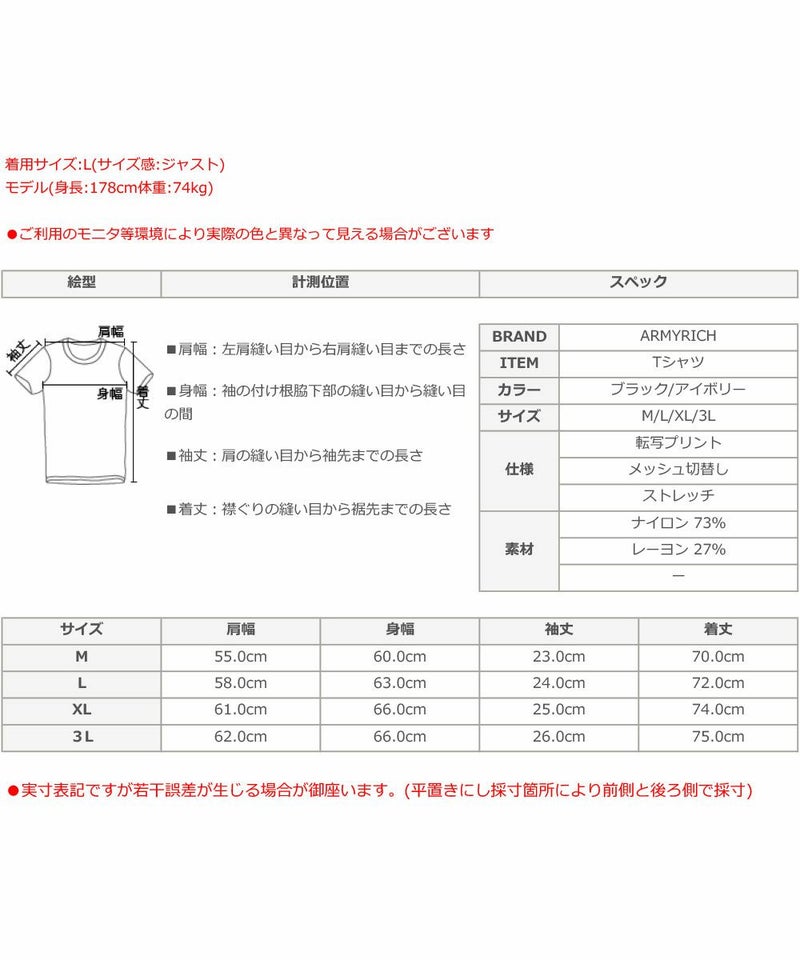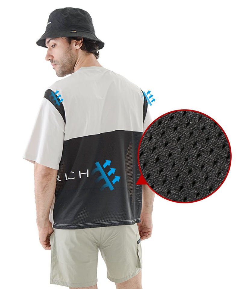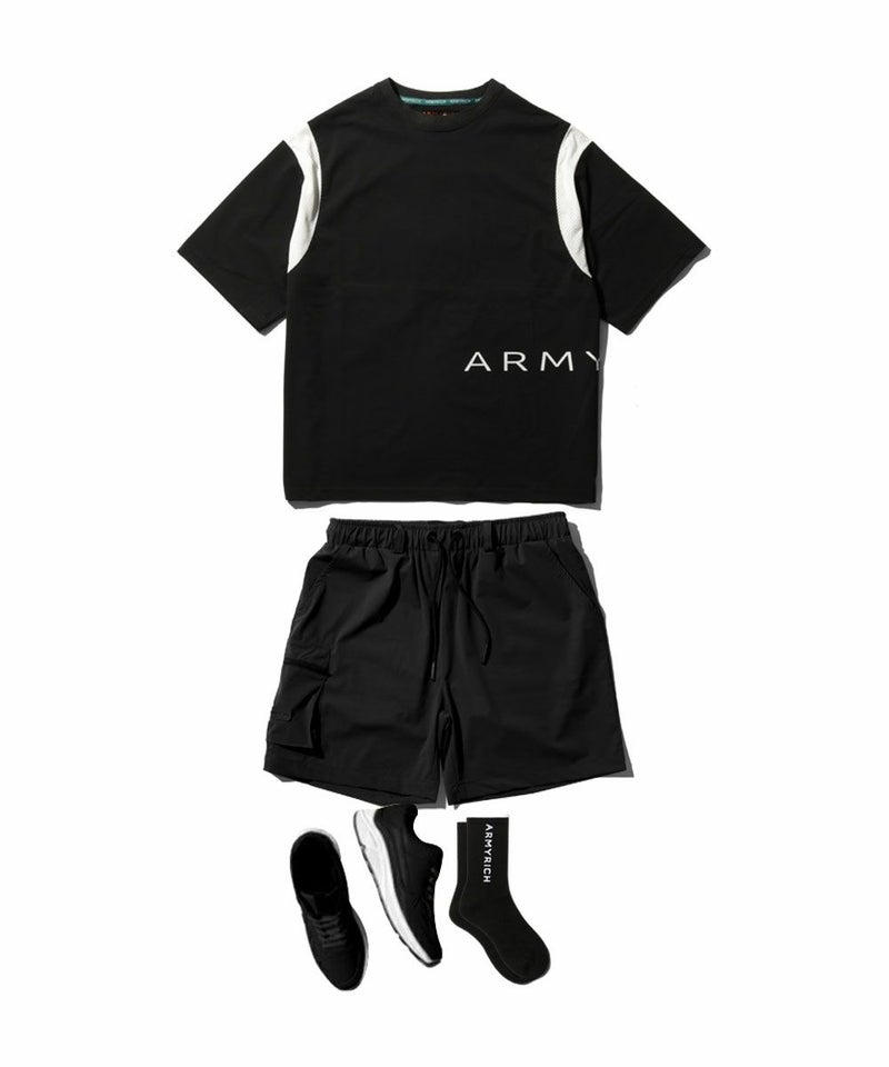 ARMYRICHの「接触冷感スパンデックスメッシュ配色Tシャツ」は、スタイリッシュな配色切り替えと高機能素材を融合させた万能Tシャツ。