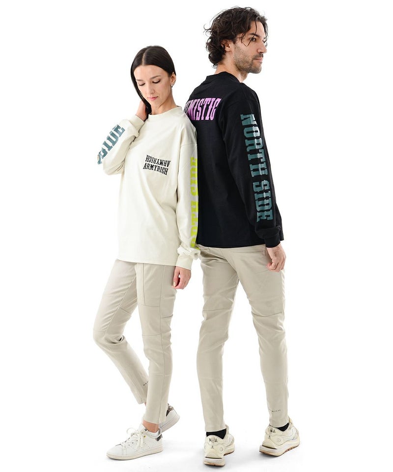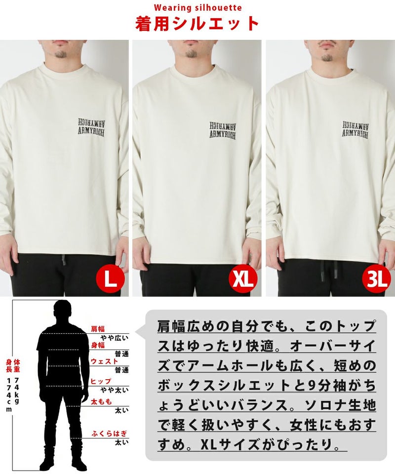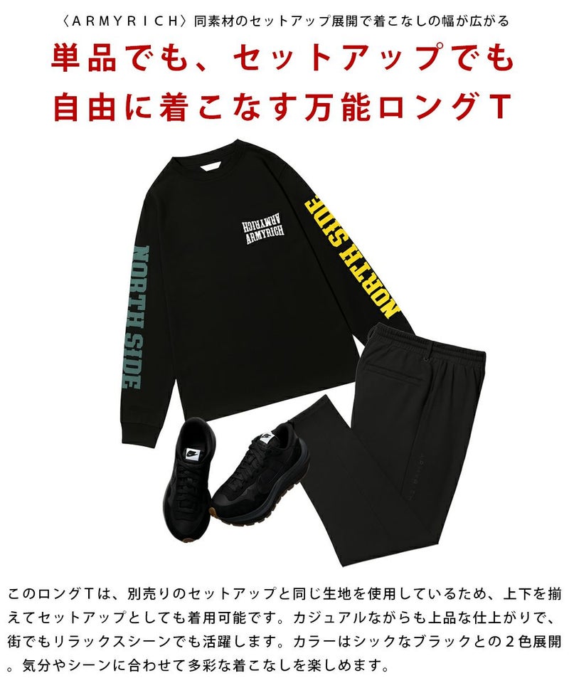 ARMYRICHから、ストリート感あふれるプリントロングTシャツが登場。 袖に映える大胆なロゴプリントがコーデの主役になる1枚です。ややオーバーサイズの程よいゆったり感で、どんな体型にもフィットしやすいシルエットに仕上げました。