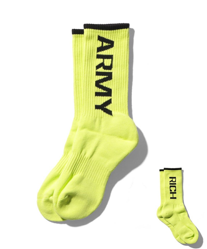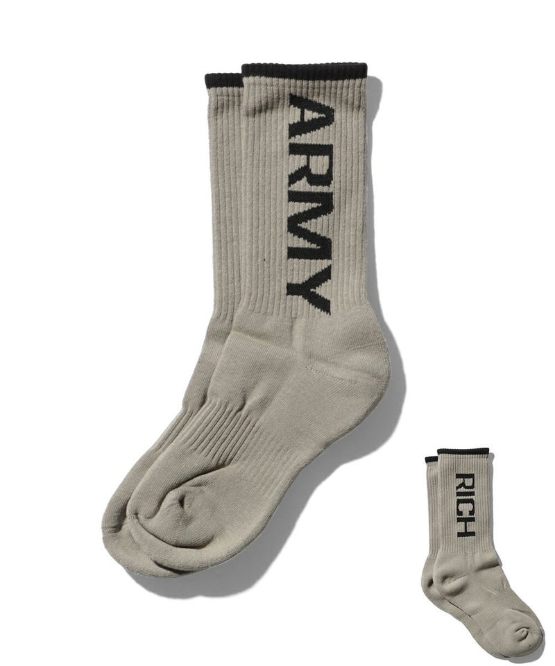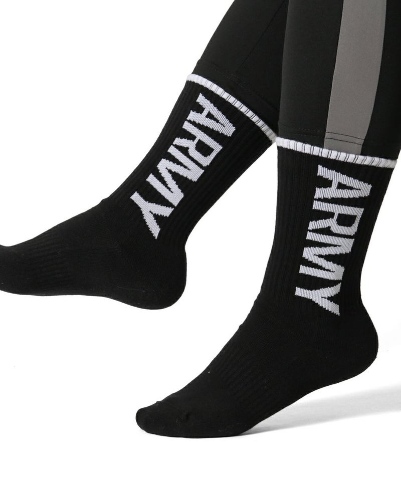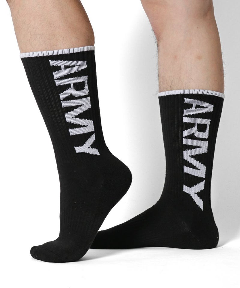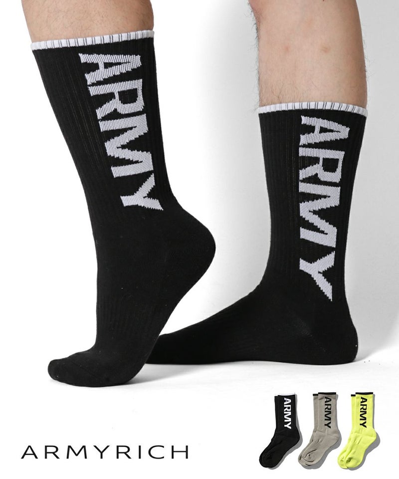 足元からスタイルを引き締めるロゴデザインがアクセント。 ARMYRICHが提案する、スポーティかつ都会的な印象をプラスするクルーソックスです。