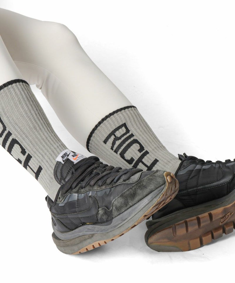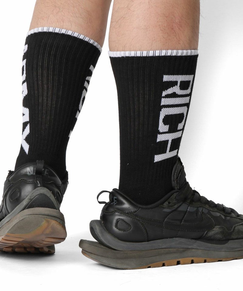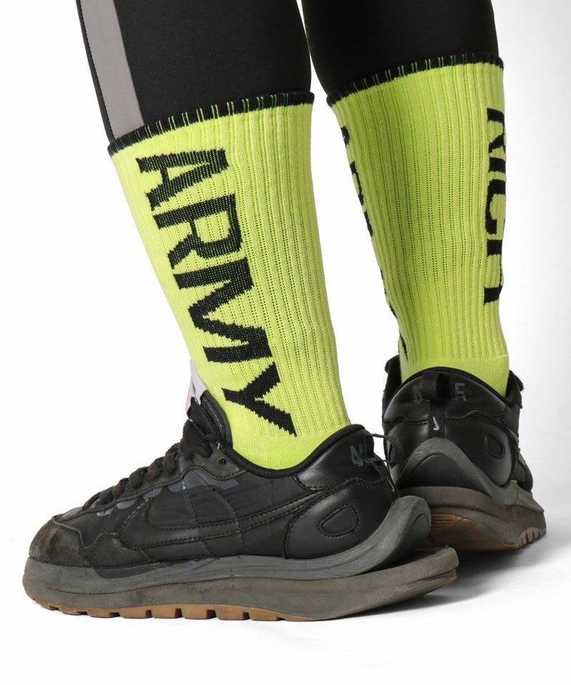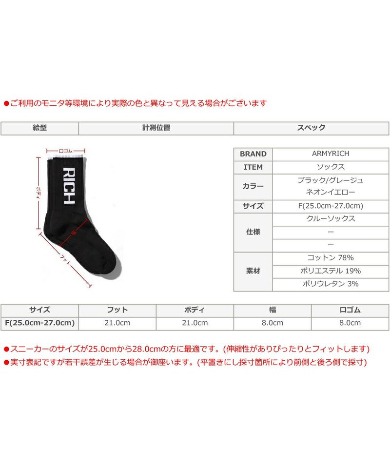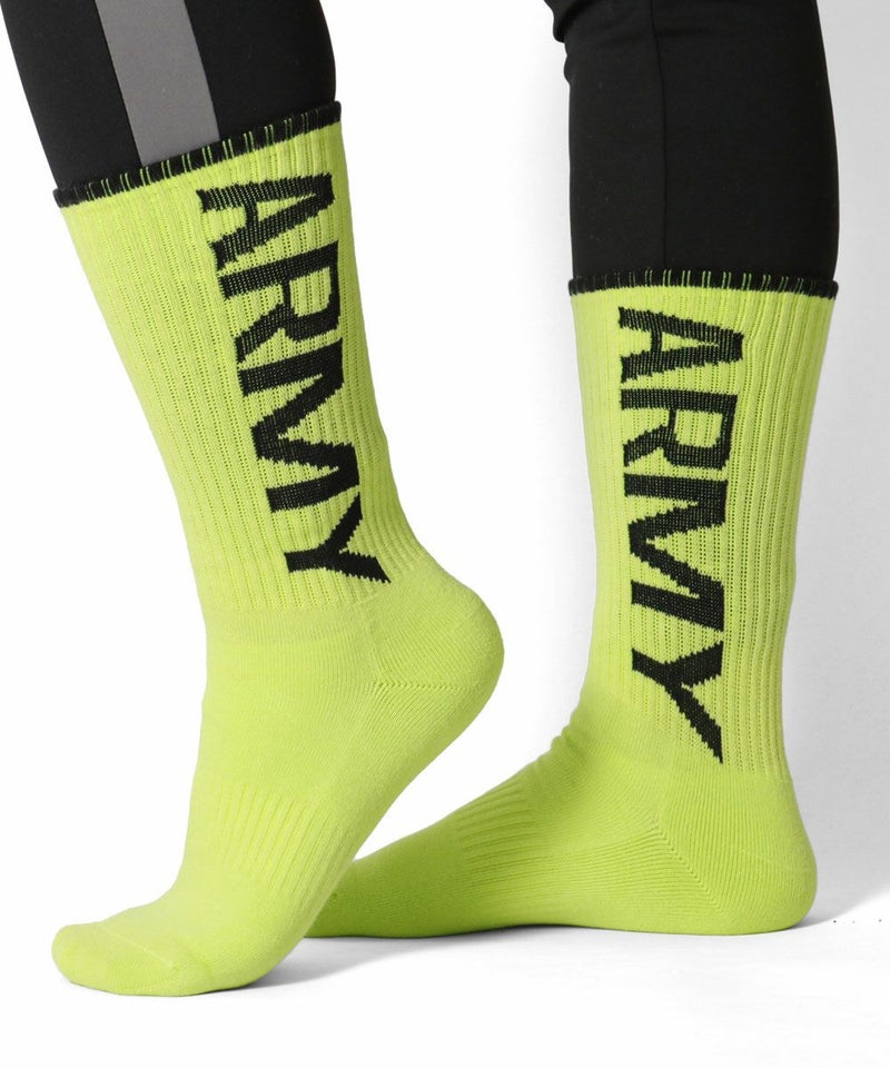 足元からスタイルを引き締めるロゴデザインがアクセント。 ARMYRICHが提案する、スポーティかつ都会的な印象をプラスするクルーソックスです。