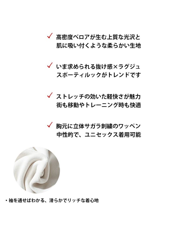 しっとりとした高密度ベロアが、光をやわらかく反射し、 スポーツウェアの軽快さに洗練された印象をプラス。 肩や腕まわりに余裕をもたせたシルエットは、動きやすさと快適さを兼ね備えながら、 身体のラインを拾いすぎないスタイリッシュな仕上がりです。