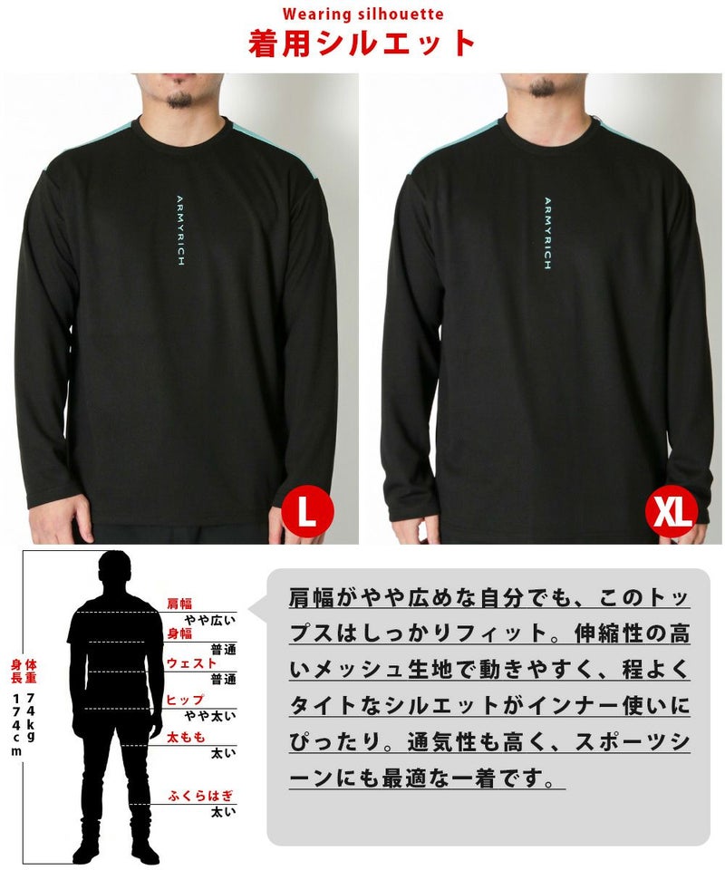 ARMYRICHのメッシュロングTシャツは、通気性に優れたメッシュ生地を使用し、汗をかいてもムレにくく快適な着心地をキープします。 細身のシルエットでジャケットのインナーにもすっきり収まり、単品でも存在感を放つスポーティーな配色デザインが魅力。