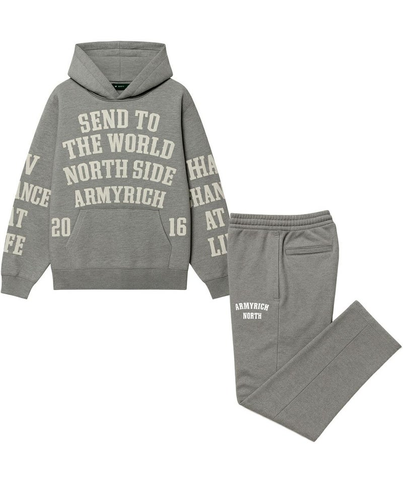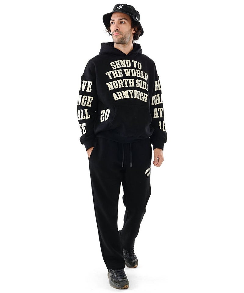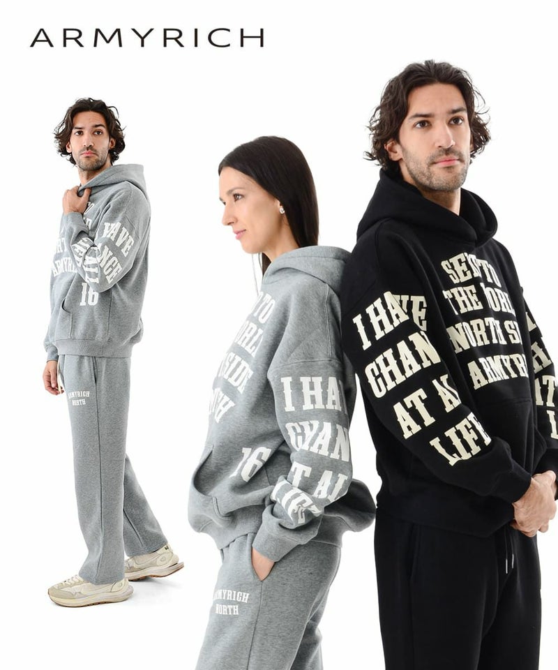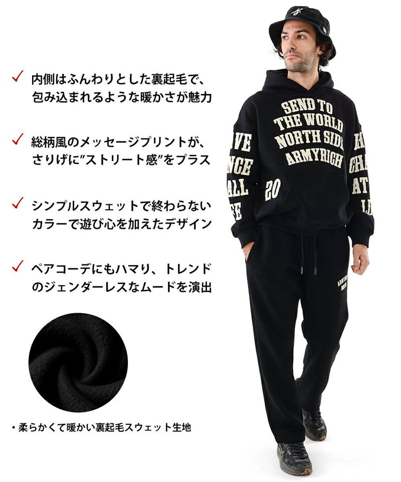 ARMYRICHから、存在感ある総柄メッセージプリントを採用した裏起毛パーカーセットアップが登場。 内側はふんわり柔らかな裏起毛素材で、寒い季節でもしっかり暖かく、包み込まれるような快適さを実現します。