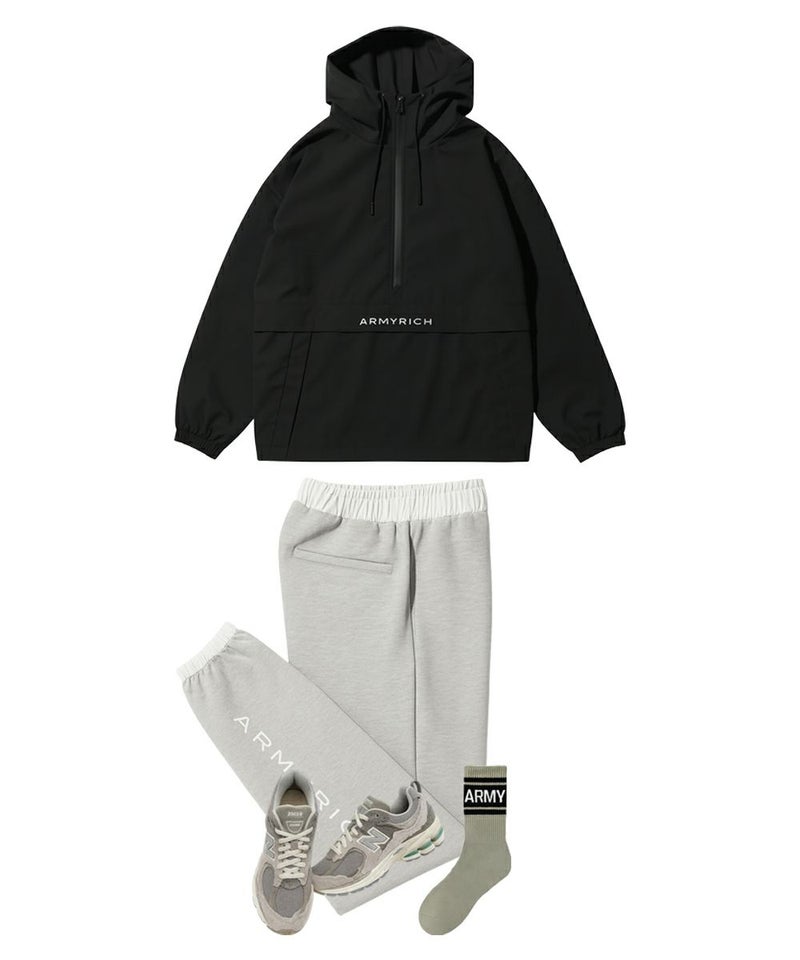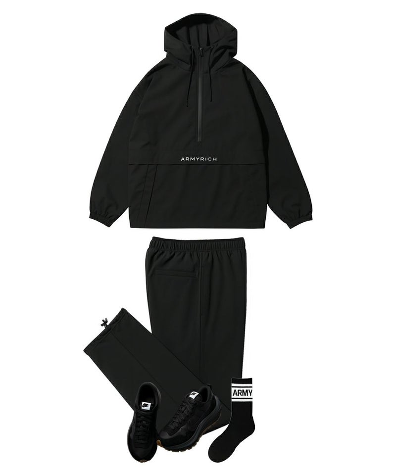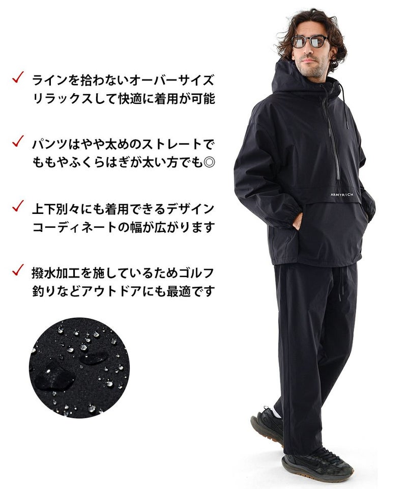 ARMYRICHから登場した「撥水ナイロンアノラックパーカーセットアップ」。 軽量でハリのあるナイロン素材を使用し、撥水加工により雨や汚れを弾く高機能ウェアです。