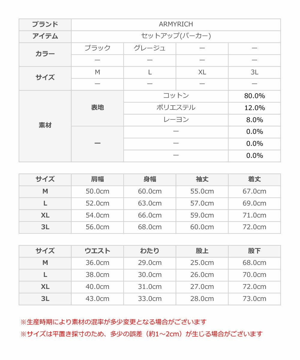 他の画像を見る ARMYRICH/25SS コーディネートセット(ドローコード付きとろみワイドTシャツ×サルエルイージーパンツ) ARMYRICH 定価 ¥ 16,280 のところ ¥ 14,000 税込 在庫切れ カートに入れる お気に入りに登録する