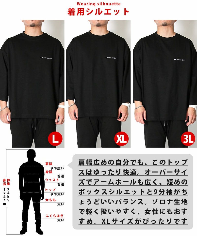 ARMYRICHの「ソロナ生地9分袖Tシャツ」は、ゆとりあるBOXシルエットで体型を拾わず、リラックスした着心地を叶える一枚です。 軽やかでサラッとしたタッチのソロナ素材は、伸縮性に優れ、長時間の着用でも快適。吸水速乾性を備えているため、夏の蒸し暑さを和らげつつ、秋口の肌寒さにも対応できる万能アイテムです。
