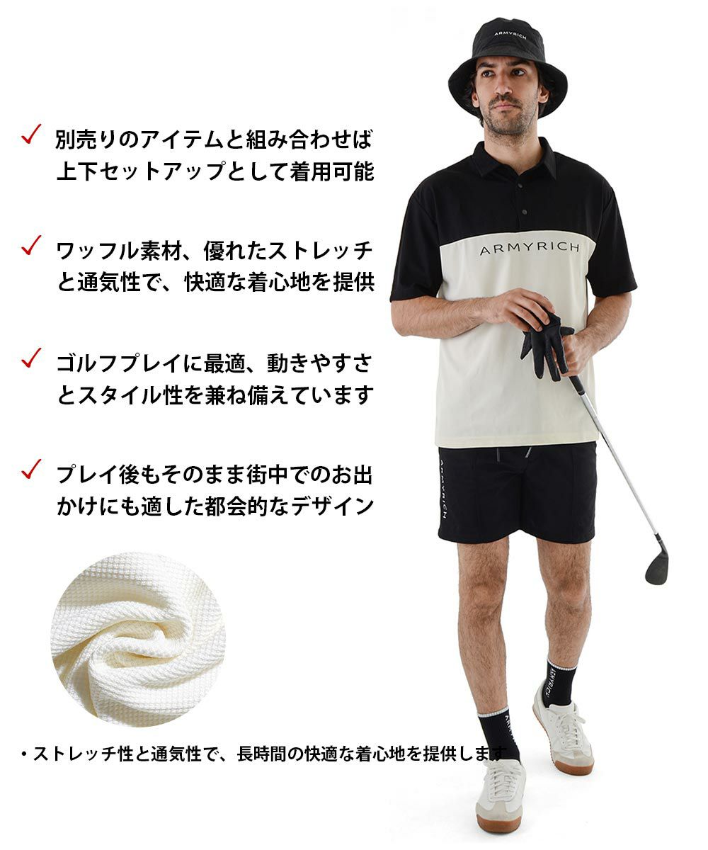 ゴルフシーンはもちろん、プレイ後にそのまま街中へ出かけても違和感のない、都会的な一着です。 ARMYRICHらしいクリーンでモダンな印象を与える、30代男性を中心にユニセックスでおすすめのポロシャツ。
