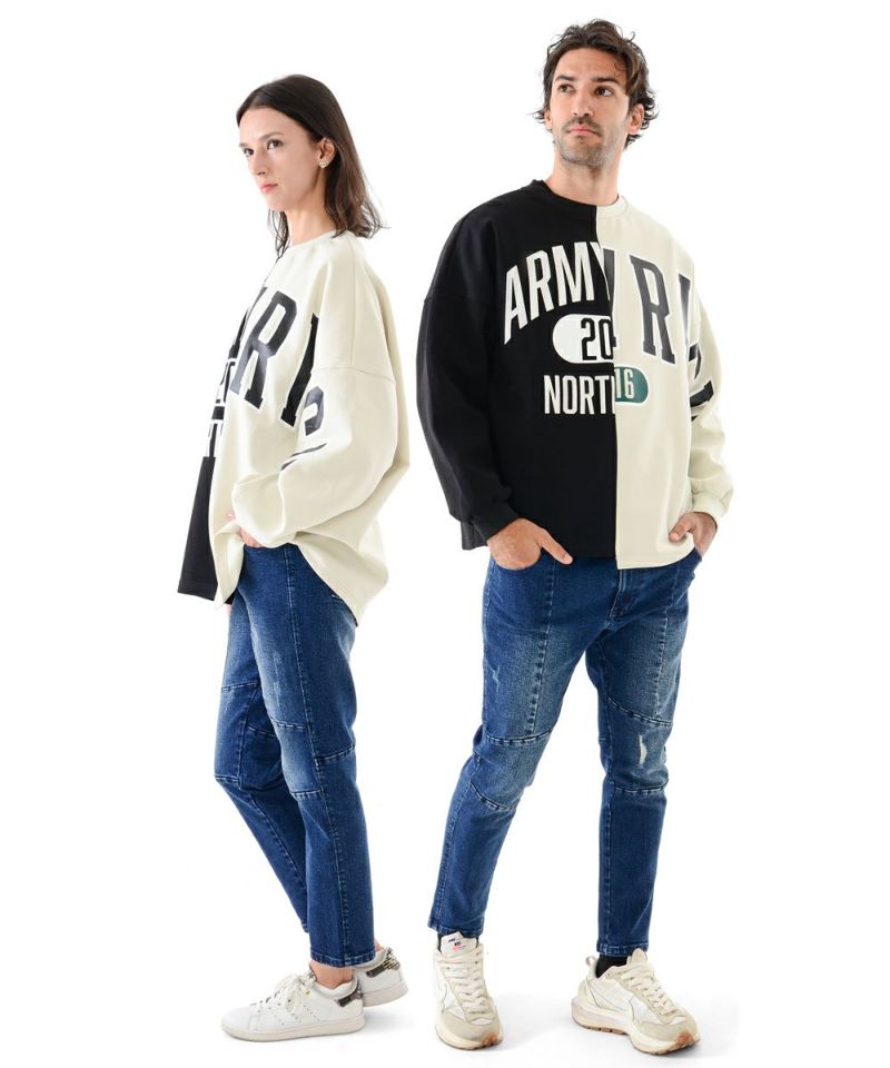 ARMYRICHから登場した「リメイク風トレーナー」は、古着をリメイクしたような大胆なドッキングデザインが魅力のスウェットトップスです。 定番のコットンボンディング生地を使用し、柔らかさとハリ感を兼ね備えた快適な着心地を実現。毎日の着用でも型崩れしにくく、長く愛用していただけます。