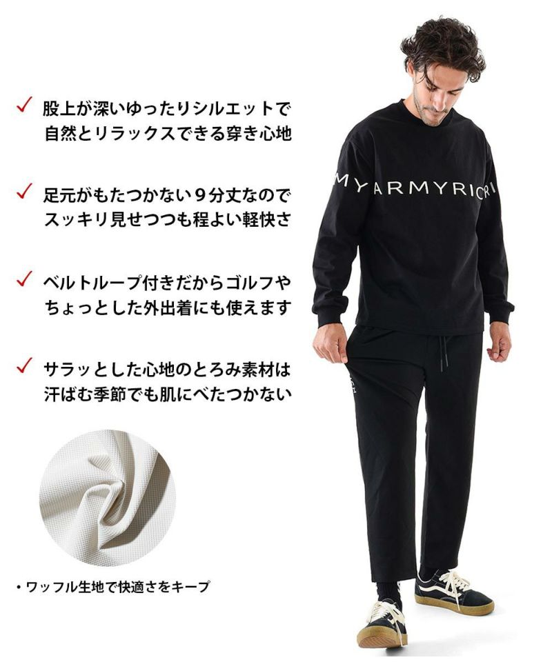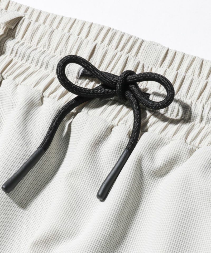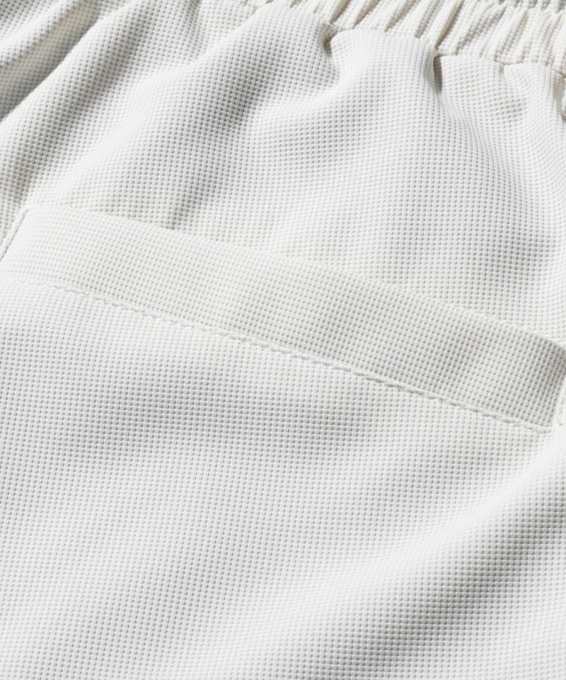 ウエストにはベルトループが備わっているため、ゴルフや外出時にも対応しやすく、着こなしの幅が広がります。 素材にはとろみ感のあるワッフル生地を使用。サラッとした肌触りでベタつかず、汗ばむ季節も快適な穿き心地をキープします。