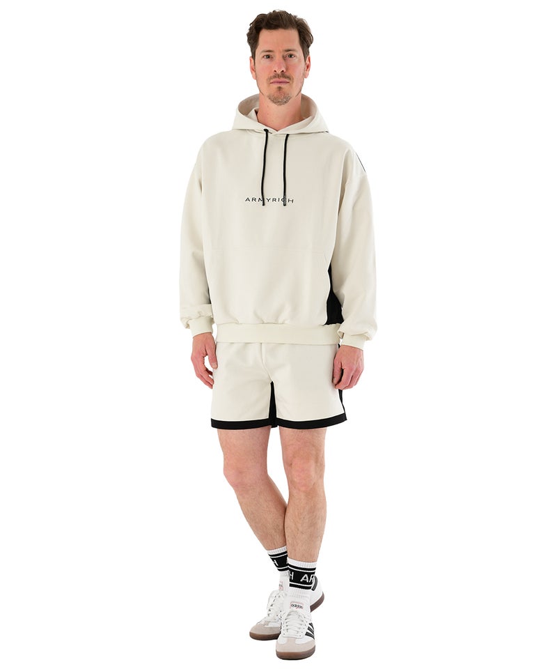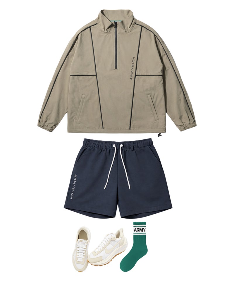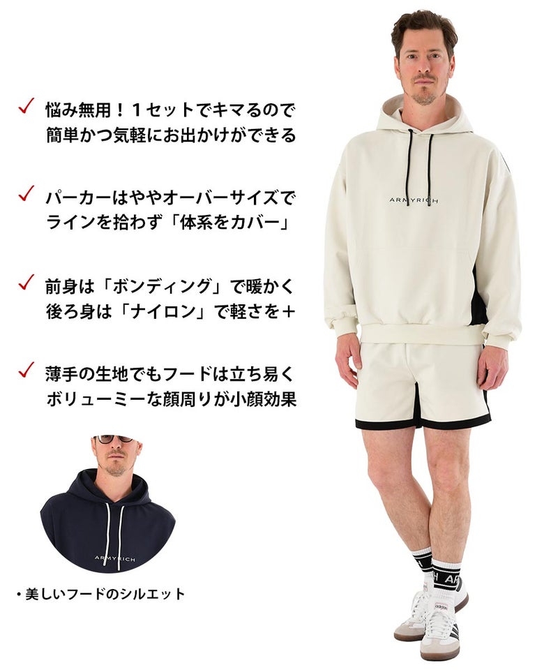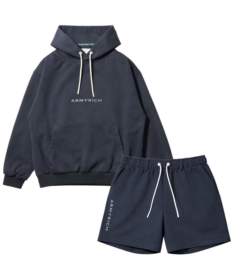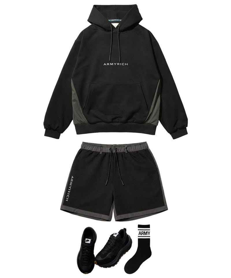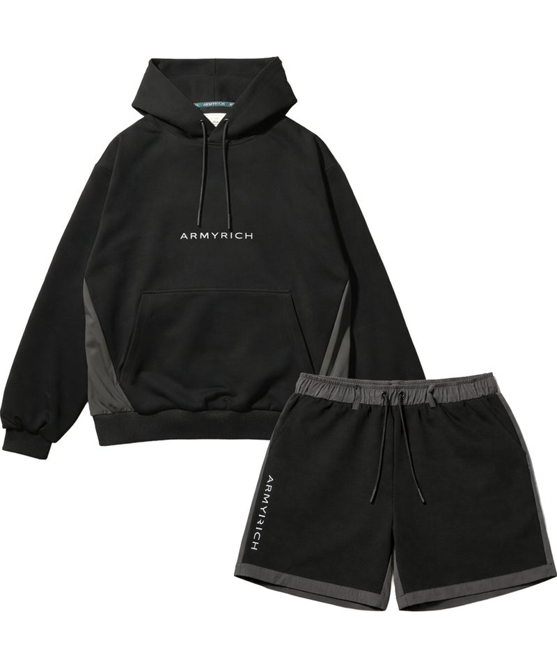 ARMYRICHより、異素材の組み合わせで機能性とデザイン性を両立したナイロン切り替えボンディングパーカーショーツセットアップが登場。 前身頃には程よいハリと保温性を兼ね備えたボンディング素材、後身頃には軽やかなナイロン素材を採用し、快適さと動きやすさを両立した一着です。