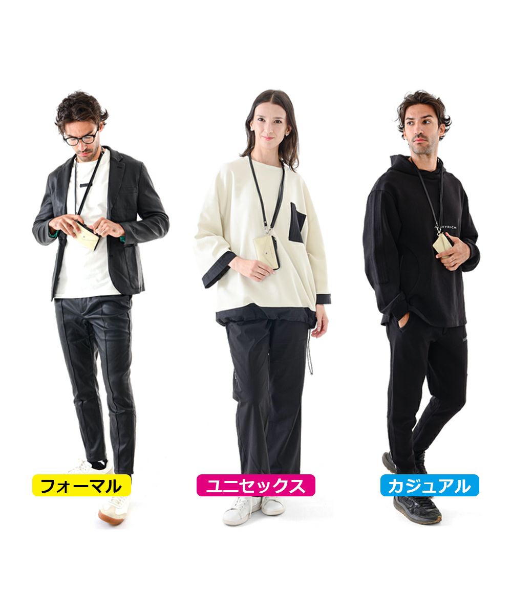 首から下げられるショルダーストラップ仕様で、両手が空く安心感とセキュリティ性を確保。 コンビニやカフェなど、ちょっとした外出にはこのウォレットひとつで十分。カード収納や小銭入れ付きで機能性も抜群です。
