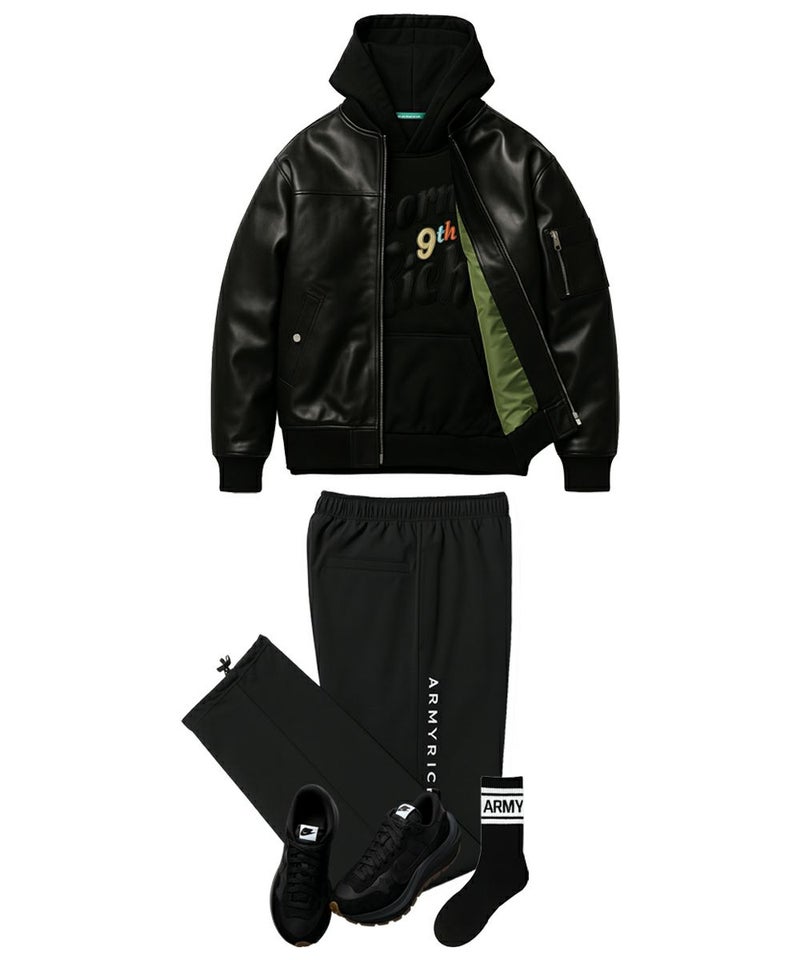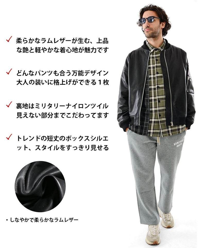 ARMYRICHから登場した「レザーMA-1ジャケット」。 柔らかくしなやかなラムレザーを使用し、上品な艶と軽やかな着心地を実現しました。