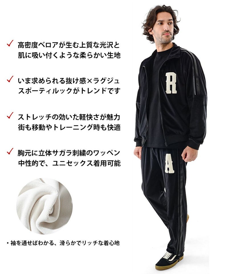 伸縮性に優れた素材は、長時間の移動やジム、ゴルフなどアクティブシーンにも最適。 休日の街着やワンマイルウェアにも馴染む、まさに“大人のためのベロアセットアップ”です。