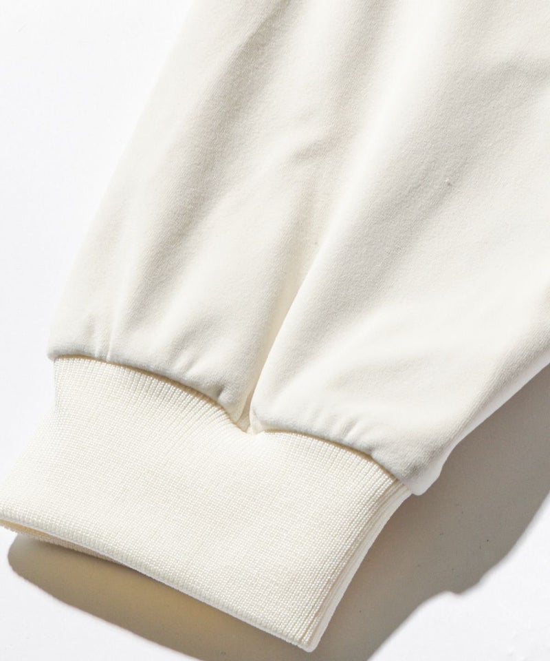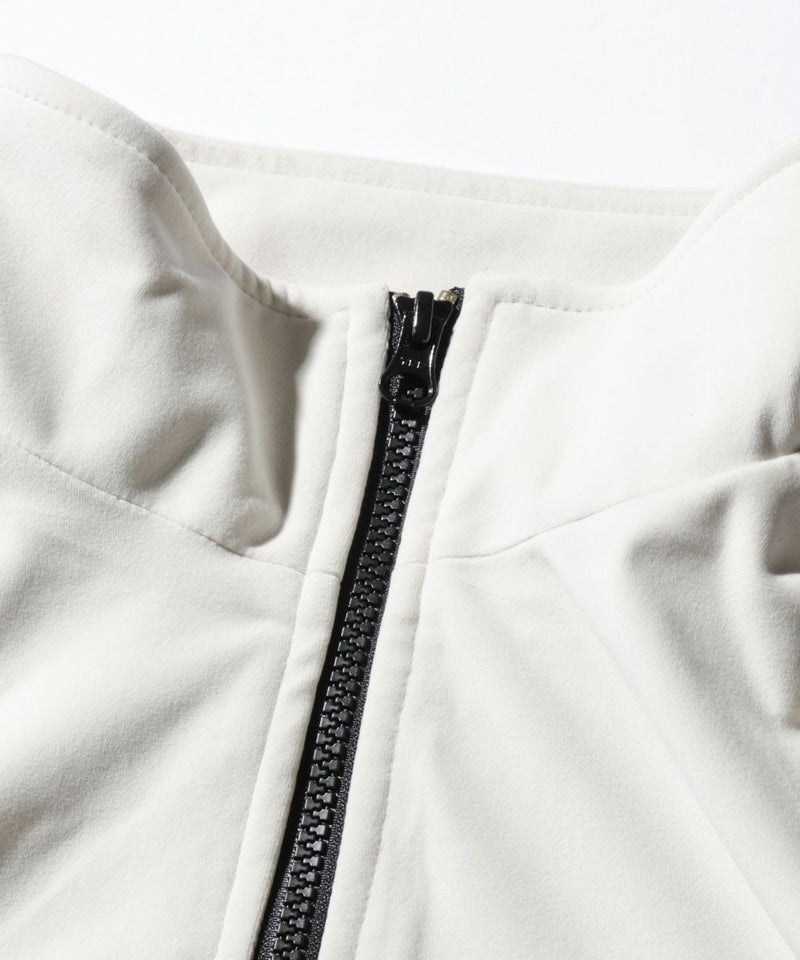 しっとりとした高密度ベロアが、光をやわらかく反射し、 スポーツウェアの軽快さに洗練された印象をプラス。 肩や腕まわりに余裕をもたせたシルエットは、動きやすさと快適さを兼ね備えながら、 身体のラインを拾いすぎないスタイリッシュな仕上がりです。