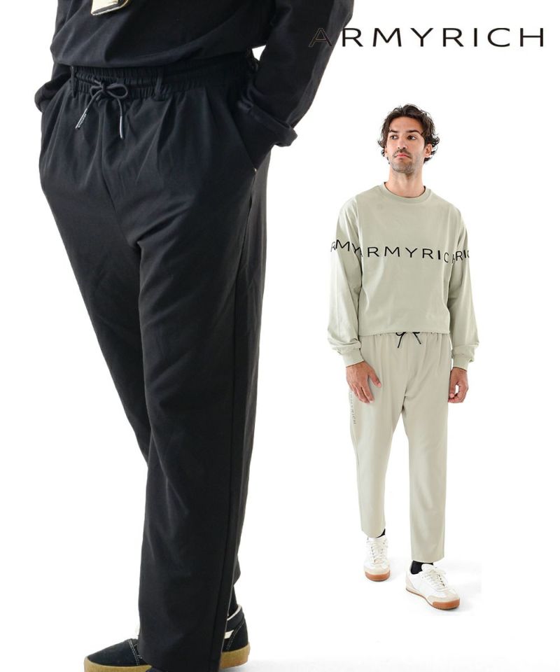 ARMYRICHの「ソロナ生地イージーパンツ」は、スキニー以上ワイド未満の絶妙なバランスで、オンでもオフでも着こなしやすい万能シルエットが魅力。