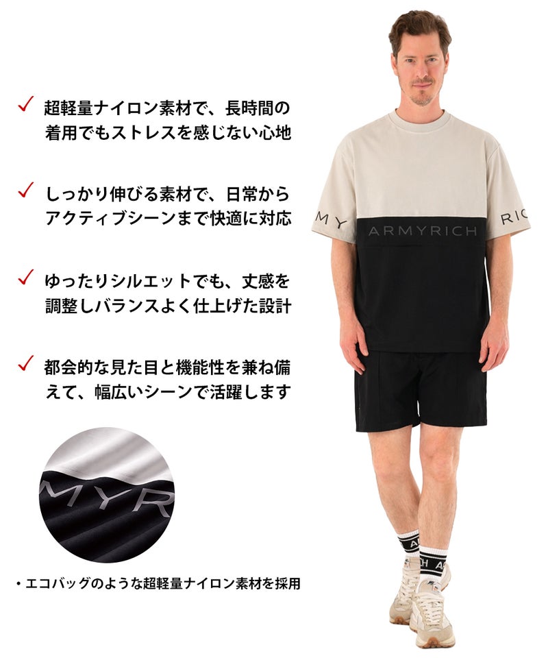 超軽量ナイロン素材を使用した、快適さと都会的なデザインを兼ね備えたストレッチナイロンTシャツセットアップ。 軽さ・動きやすさ・見た目の上品さをバランス良く仕上げた、毎日着たくなる万能な上下セットです。
