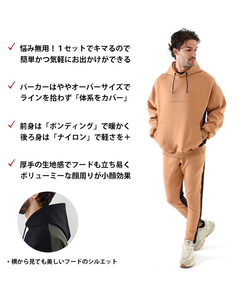 ARMYRICHの「ナイロン切替ボンディングパーカーセットアップ」は、異素材の組み合わせでシルエットと着心地の両立を叶えた上品なスポーティウェア。