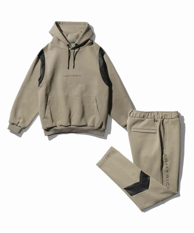 ARMYRICHの「PUレザー切替ボンディングパーカーセットアップ」は、柔らかく伸縮性に優れたボンディング素材をベースに、肩と左脚にPUレザーを切り替えたデザインが特徴。 ほどよい厚みで立体感のあるシルエットを描きつつ、軽やかでストレスフリーな着心地を実現します。
