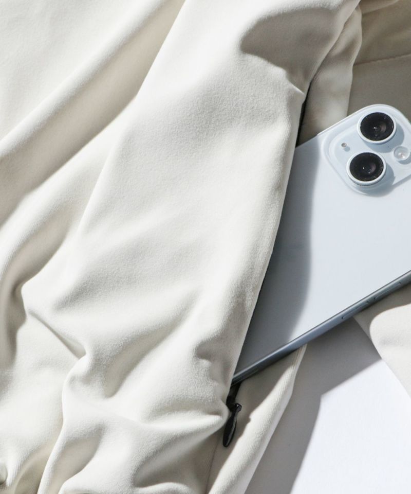 しっとりとした高密度ベロアが、光をやわらかく反射し、 スポーツウェアの軽快さに洗練された印象をプラス。 肩や腕まわりに余裕をもたせたシルエットは、動きやすさと快適さを兼ね備えながら、 身体のラインを拾いすぎないスタイリッシュな仕上がりです。