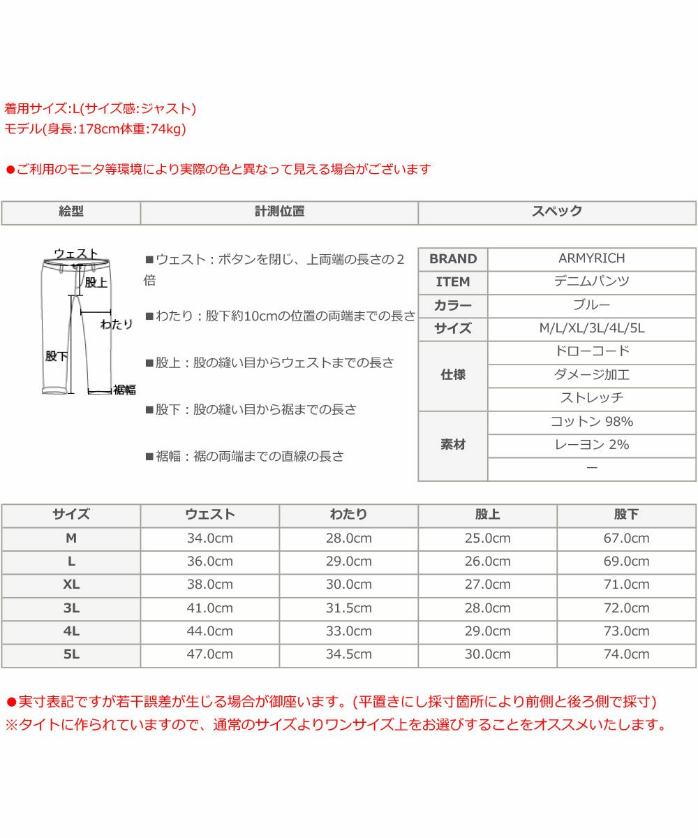 他の画像を見る ARMYRICH/25SS ダメージ加工ストレッチデニムスキニーパンツ(キングサイズ) ARMYRICH 定価 ¥ 14,080 のところ ¥ 14,080 税込 カートに入れる お気に入りに登録する